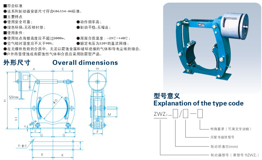 該系列制動(dòng)器符合GB6334-86標(biāo)準(zhǔn);使用安全可靠;動(dòng)作頻率高;綠色環(huán)保,無石棉襯墊;制動(dòng)平穩(wěn),無噪音;環(huán)境溫度-25℃至+40℃;額定電壓220V的直流網(wǎng)絡(luò);使用地點(diǎn)的海報(bào)高度不少過2000m;在物爆炸危險(xiǎn)的介質(zhì)中,無足以富士金屬和破壞絕緣的氣體和到點(diǎn)塵埃的場合;戶外雨雪侵蝕或有腐蝕性氣體和介質(zhì)應(yīng)采用防腐性產(chǎn)品。